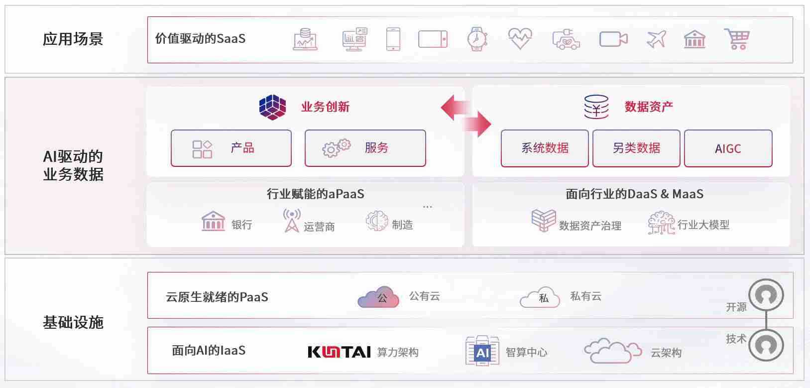 数字时代,,,围绕企业数字化转型的关键要素,,AG尊龙凯时数码开创性的提出数云融合战略和技术体系框架,,,,着力在云原生、、、、数字原生、、、、AI原生和信创产业上架构产品和服务能力,,,为处在不同数字化转型阶段的快消零售、、、汽车、、金融、、、、医疗、、、、政企、、教育、、、、运营商等行业客户提供泛在的敏捷IT能力和融合的数据驱动能力,,,构建跨界融合创新的数字业务场景和新业务模式,,,,助力企业级客户建立面向未来的核心能力和竞争优势,,,,全面推动社会的数字化、、、、智能化转型升级。。